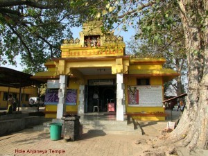 Hole Anjaneya temple located on the banks of river Shimsha, in Maddur town of Mandya district, Karnataka. Maddur is about 80 kms from Bangalore. While driving from Bangalore, one has to take a left deviation from the highway. This road goes to Maddur town. Just 10 meters from this deviation, take a left turn. There is a sign board showing way to Hole Anjaneya temple. Taking a left turn there, and driving for 3 kms, the temple is seen.