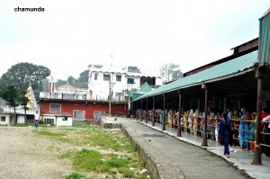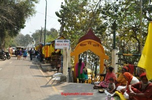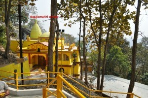 After returning from Chinnamasta temple, we will come to a small car parking area, and also steps for an over bridge. From that point, one has to take right turn and walk for about 500 meters to reach Bagalamukhi temple.
